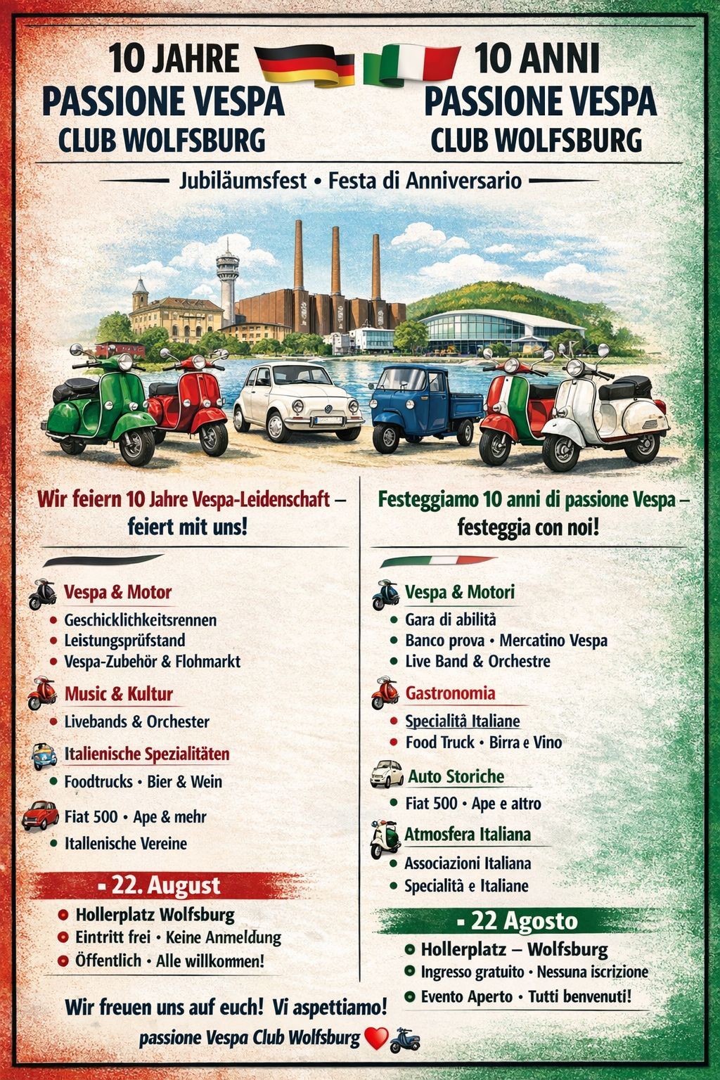 « Alle Veranstaltungen 10 Jahre Passione Vespaclub Wolfsburg August 22 « British Vespa Days 2026 Bristol 40 Jahre Vespa Club Celle » Zum Kalender hinzufügen Google Kalender iCalendar Outlook 365 Outlook Live Details Datum: August 22 Website: https://passione-vc-wolfsburg.de/mitgliederneuigkeiten/10-jahre-passione-vespaclub-wolfsburg/ Veranstalter Passione Vespa Club Wolfsburg Veranstalter-Website anzeigen Veranstaltungsort Hollerplatz, Wolfsburg Hollerplatz Wolfsburg, 38440 Germany Google Karte anzeigen