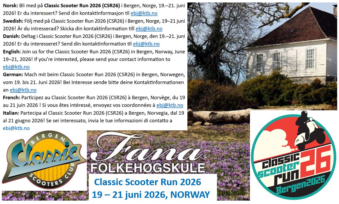 « Alle Veranstaltungen Classic Scooter Run Norwegen 2026 19. Juni 2026 - 21. Juni 2026 « Nordkapp Classic Raid IV Vespa World Days 2026 Rom » Zum Kalender hinzufügen Google Kalender iCalendar Outlook 365 Outlook Live Details Beginn: 19. Juni 2026 Ende: 21. Juni 2026 Website: https://classicscooterrun.no/ Veranstalter Classic Scooters Club Bergen Veranstalter-Website anzeigen Veranstaltungsort Fana folkehøgskule Mildevegen 190 Hjellestad, 5259 Norway Google Karte anzeigen